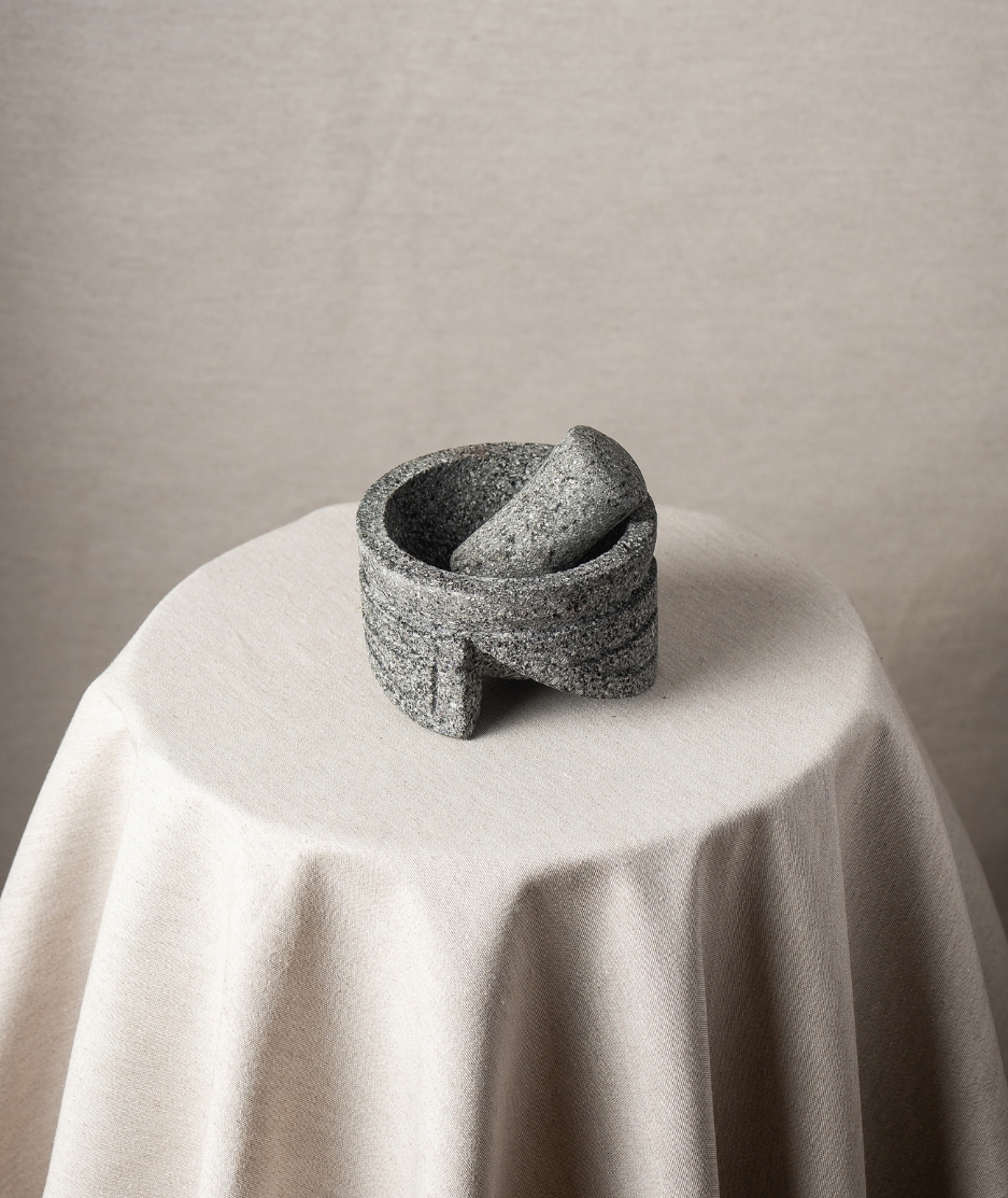 Un rescate de los utensilios de la cocina tradicional mexicana que forman parte de nuestras raìces culturales. Una propuesta innovadora de diseño con tènica lapidaria. Mortero y Tejolote, esta piedra se obtuvo de las Lavas Andesíticas basàlticas del Paleo fuego, con una antigüedad aproximada de 60 mil a 97 mil años.